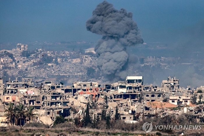 13일(현지시간) 폐허가 된 가자지구 북부에서 폭발로 인한 연기가 피어오르고 있다. AFP 연합뉴스 |