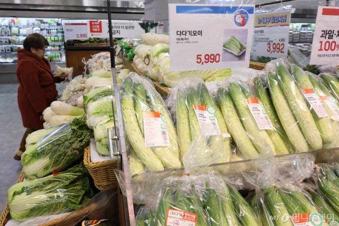 정부가 설 명절 식탁물가 안정을 위해 배추, 무, 사과 등 주요 성수품의 수급 안정 방안을 추진한다. 서울의 한 대형마트에서 고객들이 채소를 고르는 모습./사진=뉴스1. |