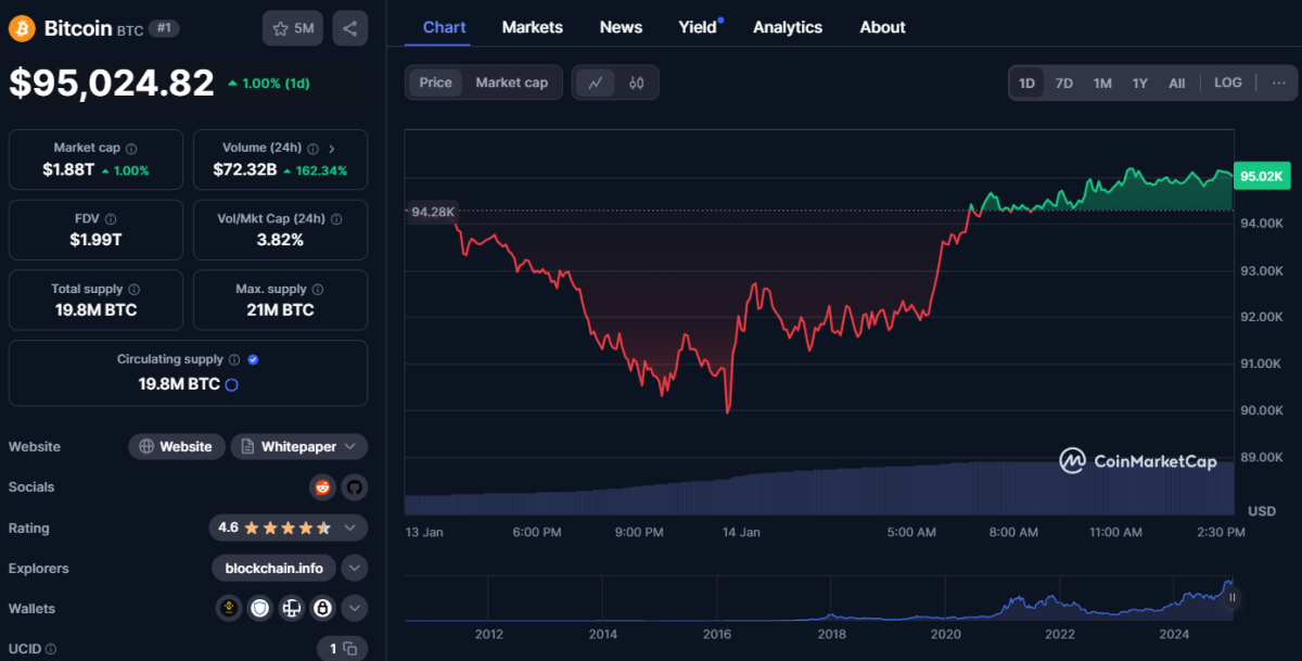 전날(13일) 밤 9만 달러 선이 붕괴했던 비트코인은 반등에 성공하며 14일 오후 3시 30분 기준 24시간 전보다 1% 상승한 9만5024달러를 나타내고 있다. |