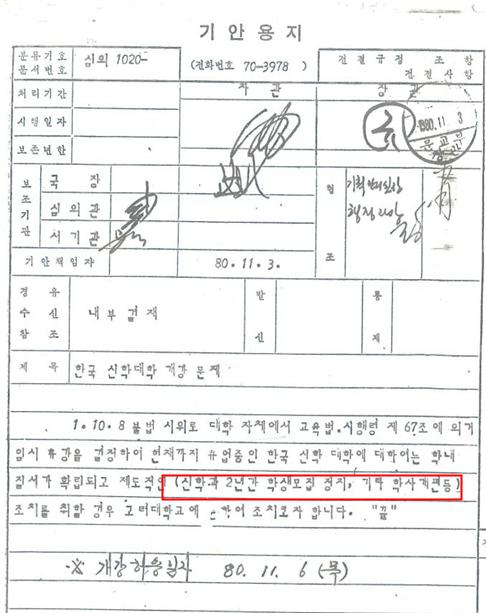 문교부, 「한국신학대학 개강 문제」(1980. 11. 3) (국가기록원) |