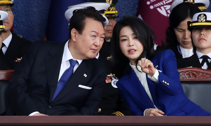 윤석열 대통령과 김건희 여사가 지난 2023년 3월 10일 경상남도 창원시 진해구 해군사관학교에서 열린 제77기 졸업 및 임관식에서 대화하고 있다. 대통령실통신사진기자단 |