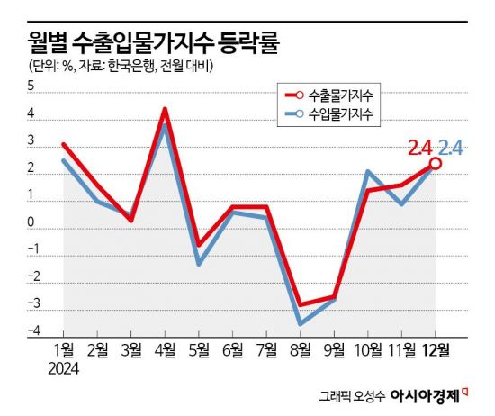 15일 한국은행이 발표한 '2024년 12월 수출입물가지수 및 무역지수(잠정)'에 따르면 지난달 수입물가(원화 기준)는 전월 대비 2.4%, 전년 동월 대비 7% 상승했다. 수입물가는 지난 10월(2.1%), 11월(0.9%)에 이어 3개월 연속 상승세다.