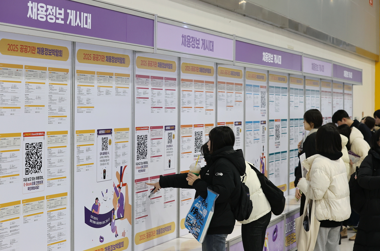 14일 서울 서초구 aT센터에서 열린 ‘2025 공공기관 채용정보박람회’를 찾은 취업 준비생들이 채용공고를 살펴보고 있다. [연합] |