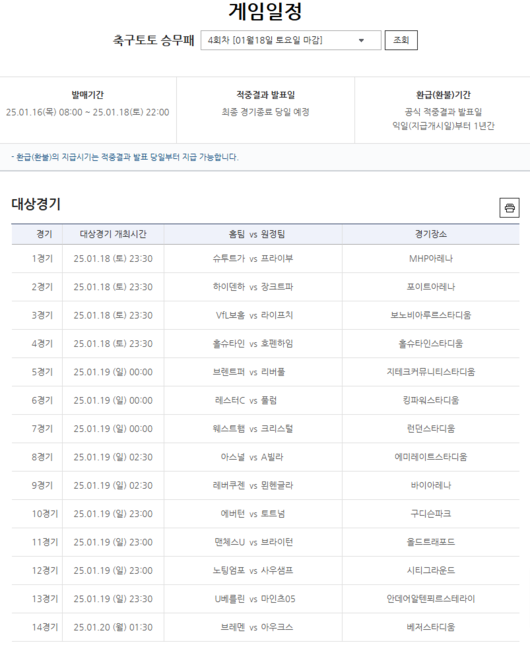 한편, 이번 축구토토 승무패 4회차에 대한 자세한 일정 및 경기 분석 내용은 공식 온라인 발매사이트 베트맨 내 토토가이드 페이지에서 확인할 수 있다.