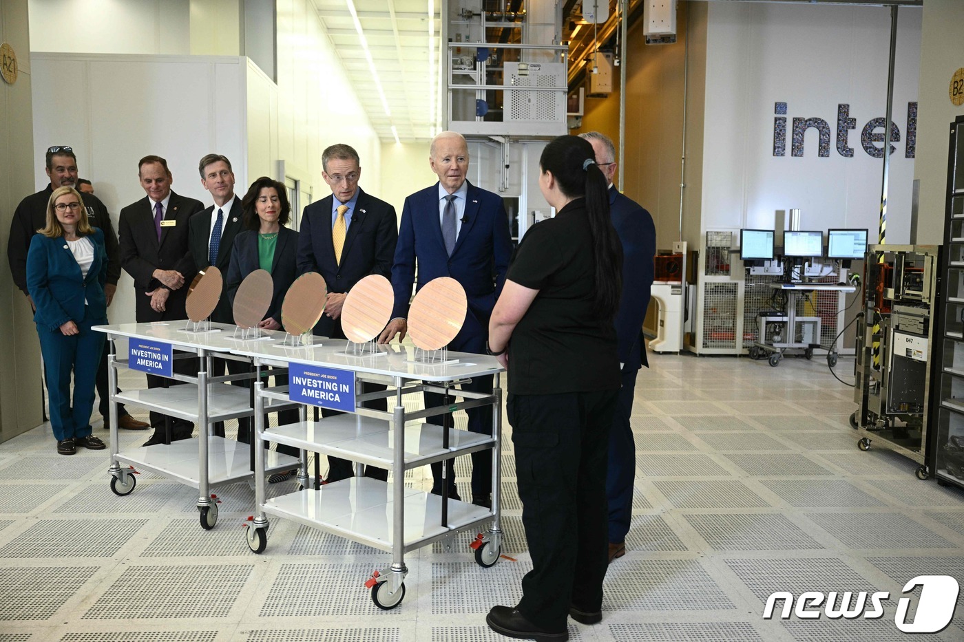 조 바이든 미국 대통령이 20일(현지시간) 애리조나주 챈들러에 있는 인텔 인텔 오코틸로 캠퍼스를 찾아 팻 갤싱어 인텔 CEO와 반도체 웨이퍼를 보며 설명을 듣고 있다. 2024.3.21 ⓒ AFP=뉴스1 ⓒ News1 우동명 기자 |