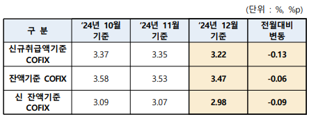 지난해 12월 신규 취급액 기준 코픽스가 11월(3.35%)보다 0.13%포인트(p) 낮은 3.22%로 집계됐다. [은행연합회] |
