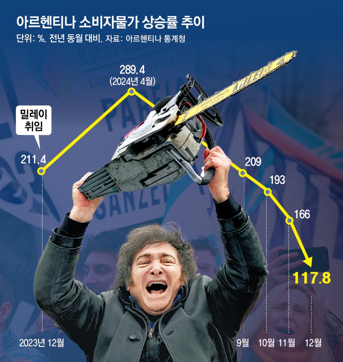 2023년 12월 취임한 ‘아르헨티나의 트럼프’ 하비에르 밀레이 아르헨티나 대통령(55)이 보조금 삭감, 공무원 해고, 정부부처 축소 등 강도 높은 구조조정으로 경제를 살려내 각국 주요 인사의 찬사를 받고 있다. 특히 최대 문제점으로 꼽혔던 살인적인 인플레이션이 잦아드는 모습이 뚜렷하다.