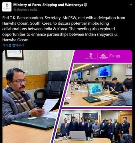 이 부처는 "쉬리 티케이 라마찬드란 인도 항만해운수로부 차관은 인도와 한국 간 잠재적인 조선업 협력 방안을 논의하기 위해 한화오션 대표단을 만났다"며 "이 자리에서 인도 조선소와 한화오션 간 파트너십을 강화할 기회도 모색했다"고 밝혔다.