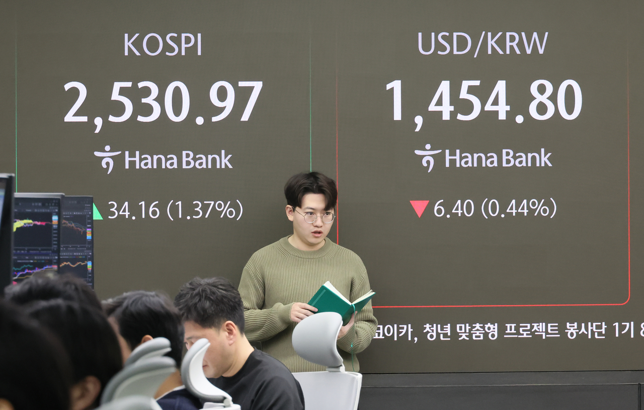 16일 서울 중구 하나은행 본점 딜링룸에서 직원들이 업무를 보고 있다. 이날 코스피는 전장보다 31.46p(1.26%) 오른 2,528.27로 출발했다. 코스닥지수는 8.74p(1.23%) 오른 720.35에, 원/달러 환율은 6.2원 내린 1,455.0원에 개장했다. [연합] |