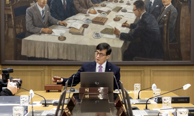 이창용 한국은행 총재가 16일 오전 서울 중구 한국은행에서 열린 금융통화위원회에서 의사봉을 두드리고 있다./사진제공=뉴스1(사진공동취재단) |