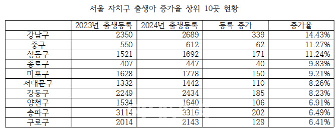 성동구도 11.24%로 두 자릿수 증가율을 기록했다. 2023년 1521명 등록보다 171명이 많은 1692명이 지난해 태어났다. 구는 가사돌봄과 산후조리비용 50~150만원을 지원하는데 소득 기준이 없다는 게 특징이다. 저소득 한부모 근로자에게는 연 최대 25만원의 자녀돌봄 휴가비도 지급한다.