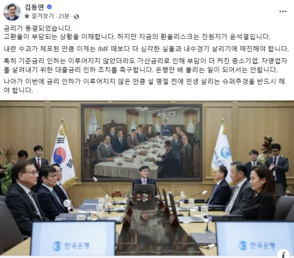 김 지사는 16일 자신의 SNS에 “금리가 동결됐다. 고환율이 부담되는 상황을 이해하지만, 지금의 환율 리스크의 진원지는 윤석열이다”라고 주장했다.
