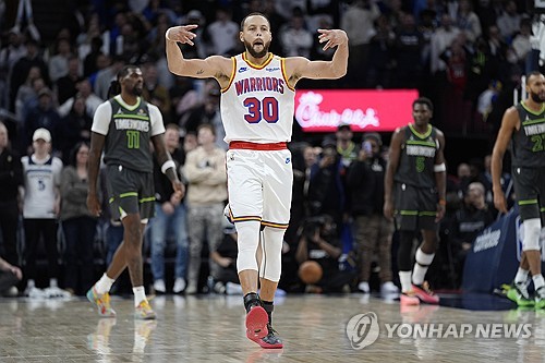 (서울=연합뉴스) 설하은 기자 = 미국프로농구(NBA) 골든스테이트 워리어스가 3점포 7방을 폭발한 간판스타 스테픈 커리의 활약 덕분에 미네소타 팀버울브스에 1점 차 진땀승을 거뒀다.