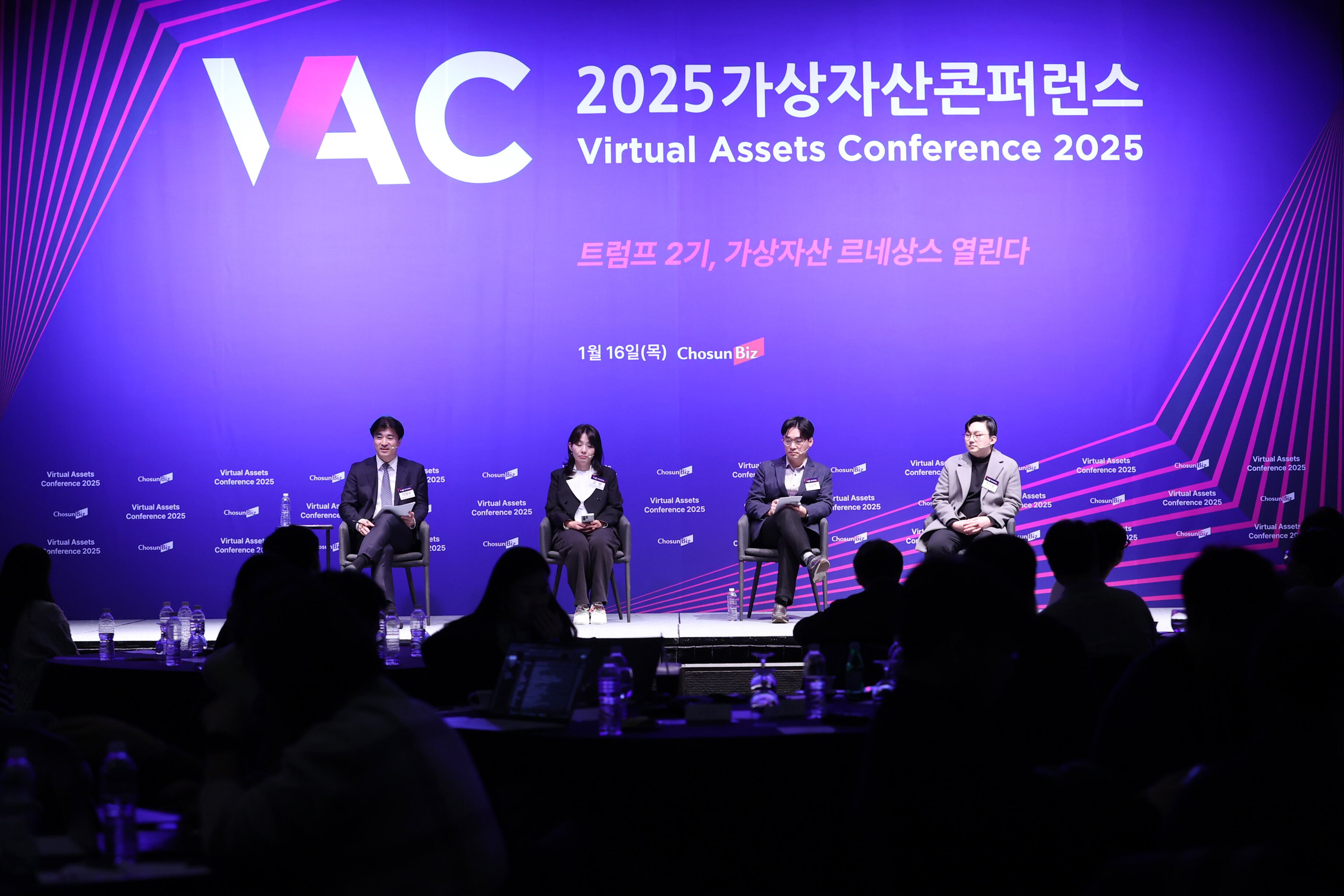 16일 서울 중구 웨스틴 조선호텔 그랜드볼룸에서 열린 ‘2025 가상자산 콘퍼런스’에서 열린 패널토의. 왼쪽부터 이정수 서울대 법학전문대학원 교수, 고란 알고란 유튜브 채널 대표, 김갑래 자본시장연구원 선임연구위원, 주기영 크립토퀀트 대표. /조선비즈 |