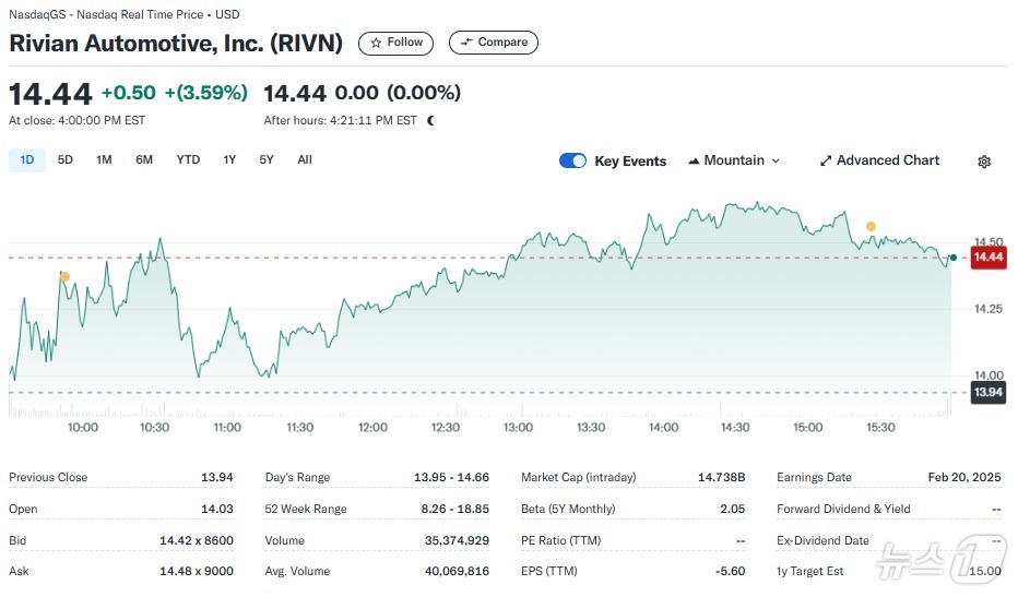 16일(현지시간) 뉴욕증시에서 리비안은 3.59% 급등한 14.44달러를 기록했다.