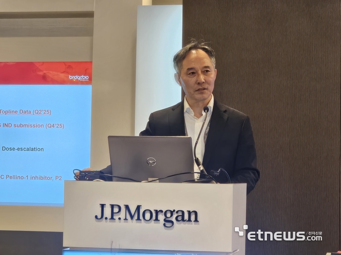 이정규 브릿지바이오테라퓨틱스 대표가 16일(현지시간) 오전 JP모건 헬스케어 콘퍼런스(JPM)에서 발표하고 있다. (사진=기자단 제공) |