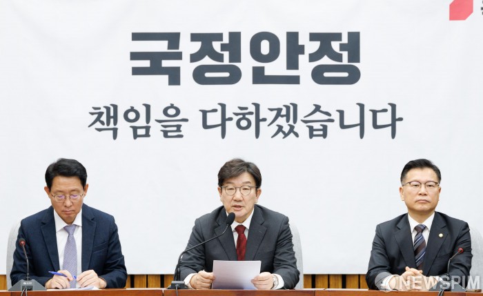 [서울=뉴스핌] 윤창빈 기자 = 권성동 국민의힘 원내대표가 17일 오전 서울 여의도 국회에서 열린 원내대책회의에서 모두발언을 하고 있다. 2025.01.17 pangbin@newspim.com