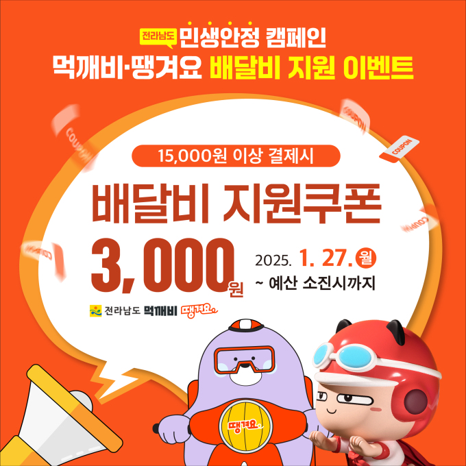 17일 전남도에 따르면 오는 20일부터 두 앱에서 지역사랑상품권으로 1만 5000원 이상 결제 시 3000원 할인쿠폰을 제공하며, 이어 27일부터 배달비 지원 쿠폰도 제공된다. 두 혜택은 중복 가능하다.