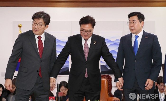 [서울=뉴스핌] 정일구 기자 = 우원식 국회의장과 권성동 국민의힘 원내대표, 박찬대 더불어민주당 원내대표가 17일 오후 국회 의장실에서 열린 국회의장 및 양당 원내대표 회동에 앞서 기념촬영을 하고 있다. 2025.01.17 mironj19@newspim.com