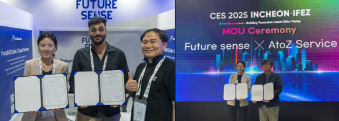 퓨처센스가 2024년 10월 ‘GITEX’ 전시회(사진 왼쪽)와 2025년 1월 ‘CES’ 전시회에서 푸드포체인 솔루션 공급 MOU를 체결했다./사진제공=퓨처센스 |