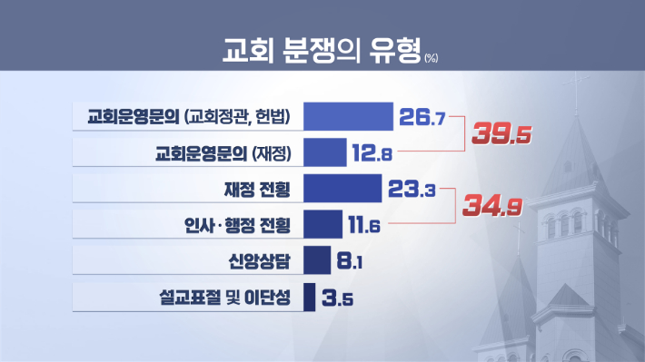 분쟁 상황을 악화시키거나 동조한 부류는 장로가 44.2%로 가장 많았고, 원로목사도 13.5%나 됐습니다.