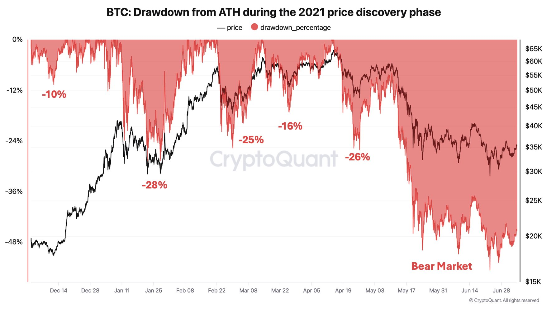 2020년에서 2021년 사이 비트코인은 최고점을 찍은 후 30% 내외 급락을 거듭했다. (크립토퀀트 제공) |