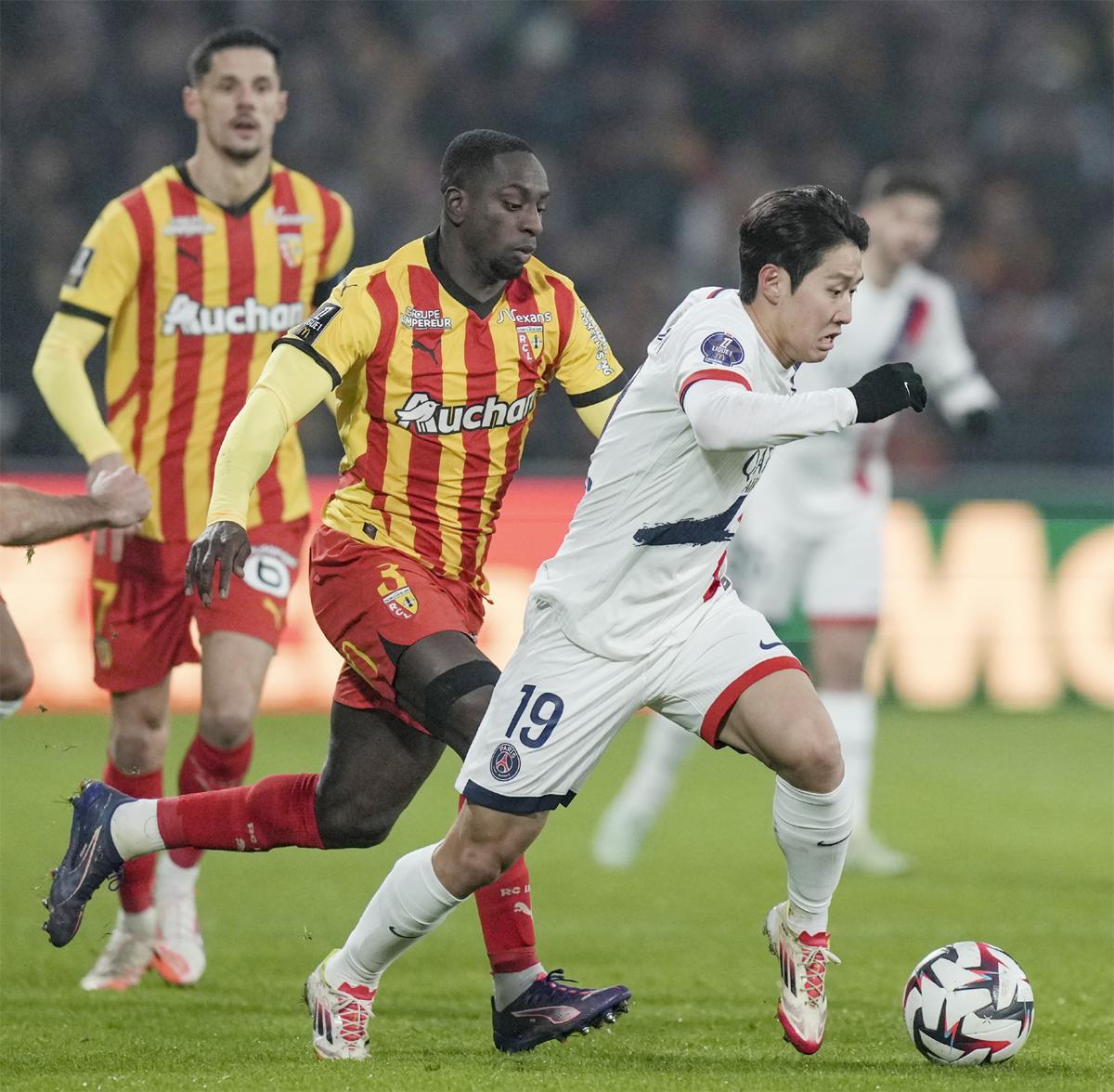 파리 생제르맹(PSG)의 이강인(오른쪽)이 19일 랑스와의 2024∼2025시즌 프랑스 리그1 방문경기에서 드리블을 하고 있다. PSG는 2-1로 역전승했다. 랑스=AP 뉴시스 |
