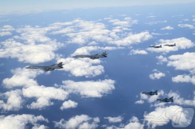 지난 15일 한반도 인근 공해상공에서 한미일 연합공중훈련이 진행되고 있는 모습/사진=뉴스1(사진제공=미 7공군) |