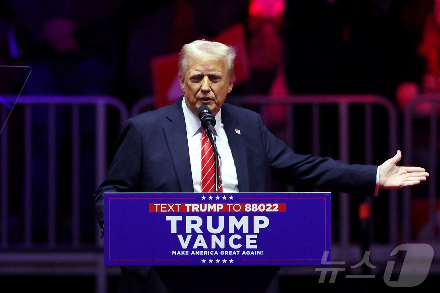 이날 트럼프는 빨간색 바탕에 흰색 사선이 그려진 넥타이를 매고 자신감에 가득 찬 얼굴로 집회에 참석했다.