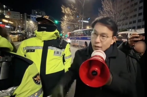 18일 밤 서울서부지법 앞에서 확성기로 윤석열 대통령 지지자들에게 '구속의 부당성'을 역설하고 있는 윤상현 국민의힘 의원./(유튜브 갈무리) 뉴스1 |