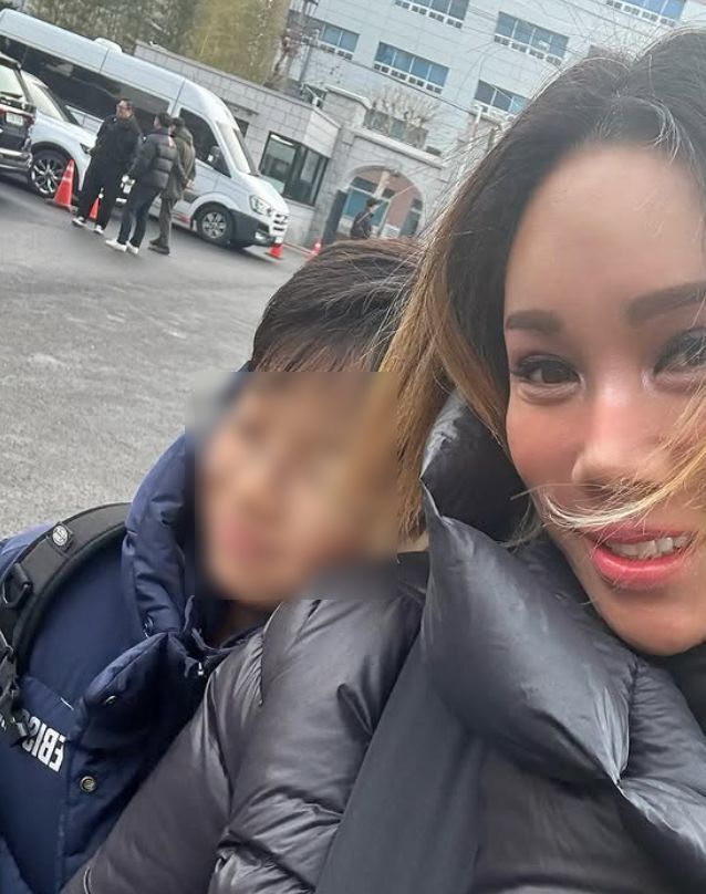 사진 속 김송은 아들 강선 군과 함께 교회 앞에서 셀카를 찍었다.