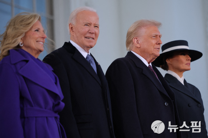 [워싱턴 로이터=뉴스핌]김근철 기자=도널드 트럼프 미국 대통령 당선인(오른쪽에서 두번째)와 부인 멜라니아 여사가 20일(현지시간) 취임식을 앞두고 백악관을 방문해 조 바이든 대통령 부부과 함께 기념 사진을 찍고 있다. 2025.01.21 kckim100@newspim.com |