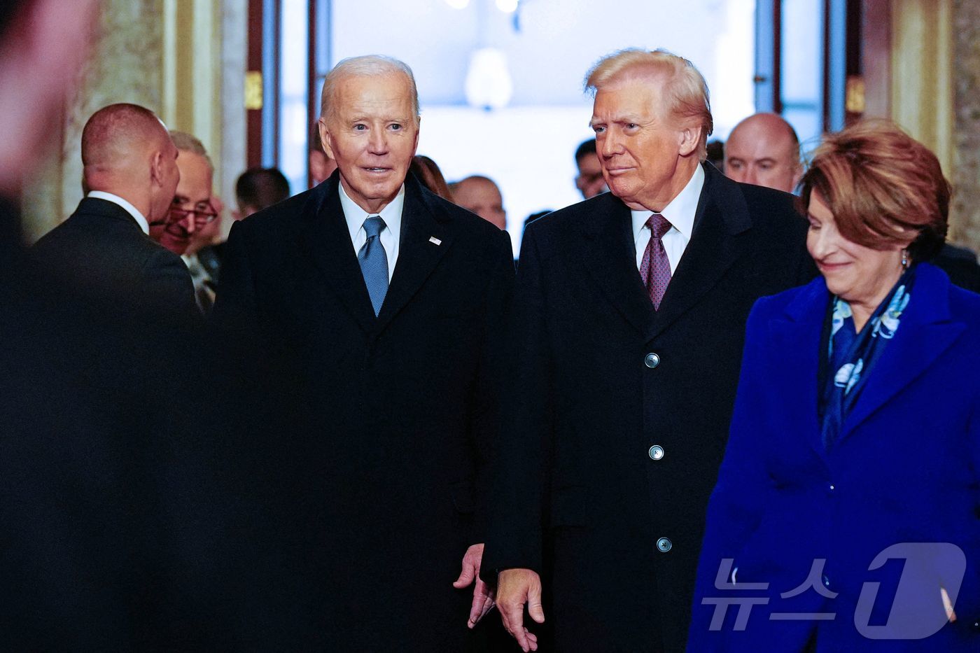 (서울=뉴스1) 이창규 기자 = 도널드 트럼프 미국 대통령 당선인이 20일(현지시간) 조 바이든 대통령과 함께 취임식이 열리는 의회의사당에 도착했다.