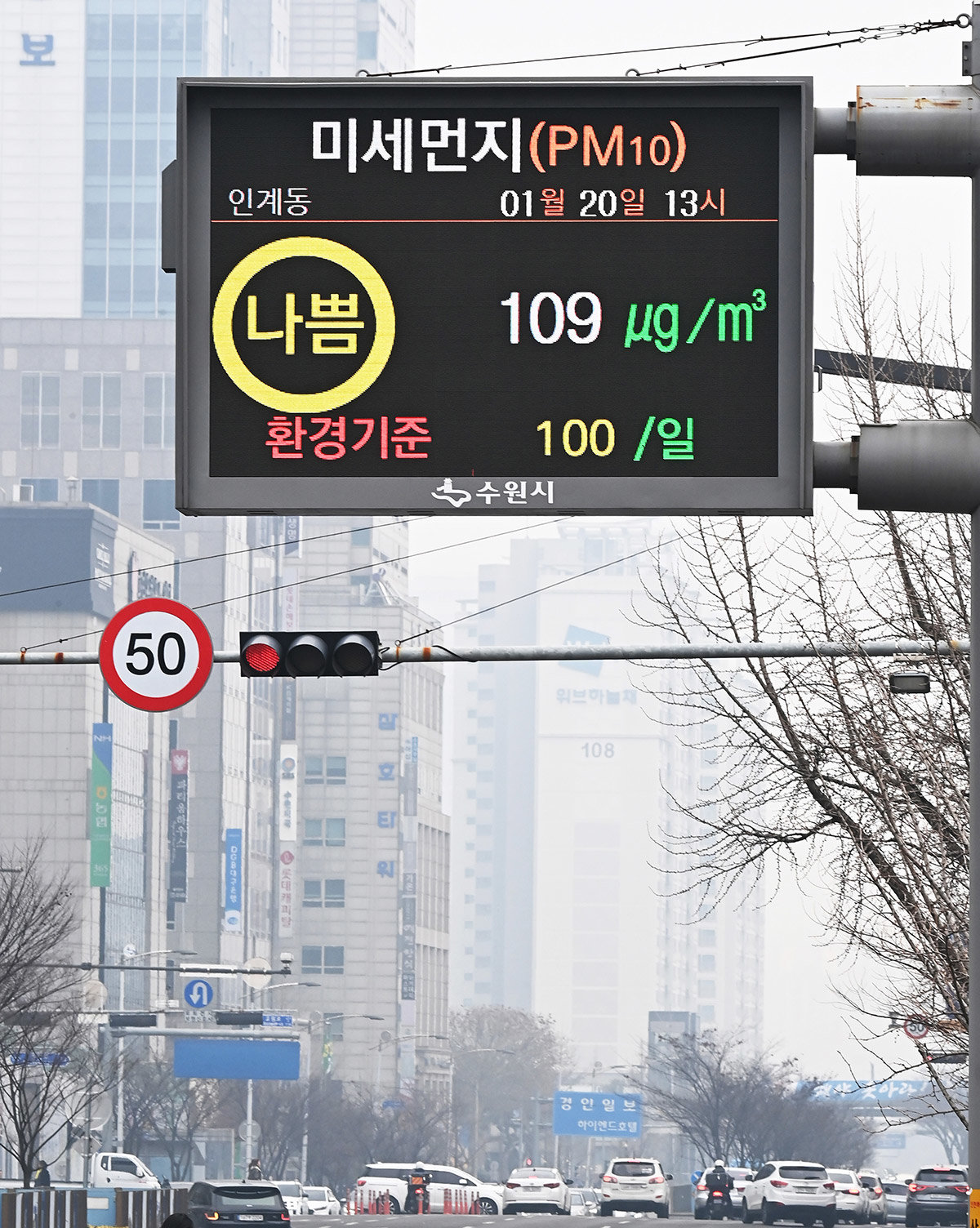 20일 경기 수원시 팔달구 수원시청 앞에 설치된 전광판에 미세먼지 ‘나쁨’ 수준을 나타내고 있다. 이날 서울에는 이번 겨울 처음으로 초미세먼지(PM2.5)주의보가 내려졌다. 21일에도 수도권 등 전국 곳곳에서 미세먼지 농도가 ‘나쁨’ 수준을 보이겠고 전국 아침 최저기온은 영하 6도∼2도, 낮 최고기온은 6∼12도로 예보됐다.
