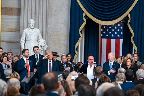 조 바이든 전 미국 대통령이 도널드 트럼프 대통령의 취임식에 카멀라 해리스 전 부통령과 함께 참석한 모습 |
