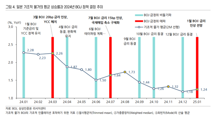 일본 기조적 물가의 평균 상승률과 2024년 BOJ 정책 결정 추이. [사진 출처 = 상상인증권] |