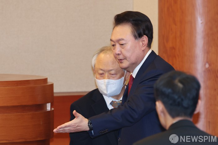 [서울=뉴스핌] 사진공동취재단 = 윤석열 대통령이 21일 오후 서울 종로구 재동 헌법재판소에서 열린 탄핵심판 3차 변론기일에 출석해 피청구인 측에 앉고 있다. 2025.01.21 photo@newspim.com