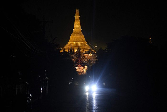 정전된 미얀마 양곤 시내를 지난 14일(현지시간) 한 차량이 달리고 있다. AFP연합뉴스 |