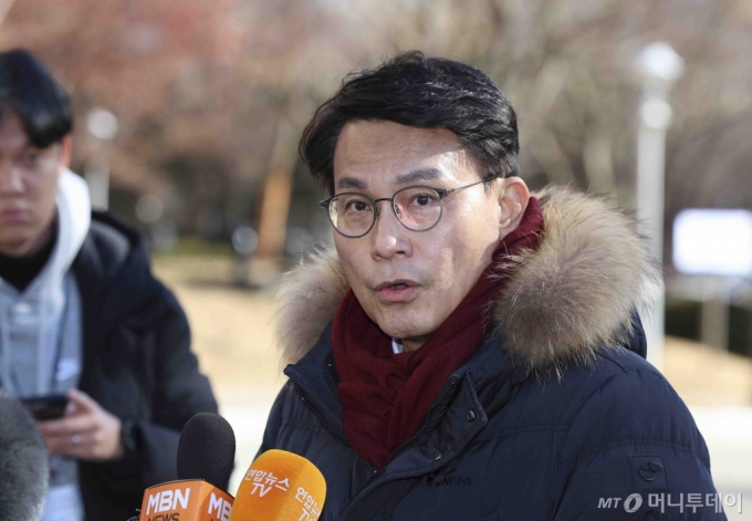 [과천=뉴시스] 김근수 기자 = 윤상현 국민의힘 의원이 15일 경기 과천시 고위공직자범죄수사처 청사 앞에서 열린 긴급 기자회견에서 취재진 질문에 답하고 있다. 2025.01.15. ks@newsis.com /사진=김근수 |