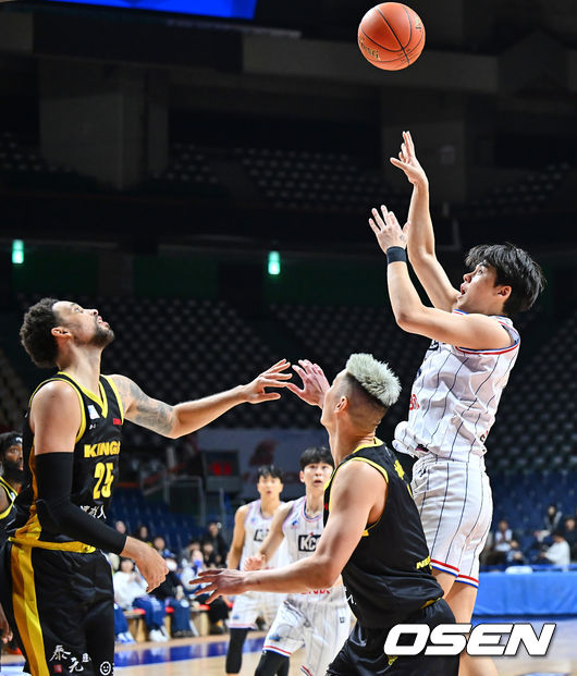 부산 KCC 김동현이 뉴 타이베이 킹스 Jeremy Lin, Austin Daye의 마크를 피해 골밑슛을 시도하고 있다. 2025.01.21 / foto0307@osen.co.kr
