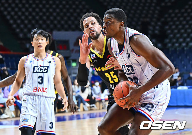 부산 KCC 캐디 라렌이 뉴 타이베이 킹스 Chris Johnson의 마크를 피해 골밑슛을 시도하고 있다. 2025.01.21 / foto0307@osen.co.kr