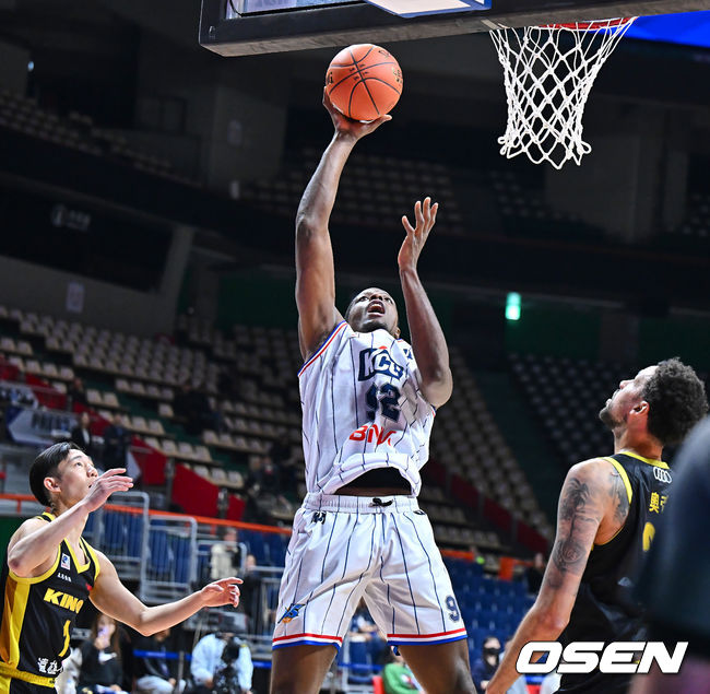 부산 KCC 캐디 라렌이 뉴 타이베이 킹스 Austin Daye와 Joseph Lin의 마크를 피해 골밑슛을 시도하고 있다. 2025.01.21 / foto0307@osen.co.kr