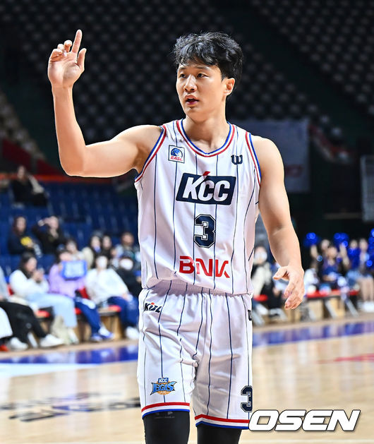 부산 KCC 허웅이 골밑슛을 성공시킨 라렌을 보며 손을 들어 보이고 있다. 2025.01.21 / foto0307@osen.co.kr