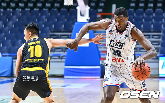 부산 KCC 캐디 라렌이 뉴 타이베이 킹스 Chien You-Che의 마크를 피해 골밑돌파를 시도하고 있다. 2025.01.21 / foto0307@osen.co.kr
