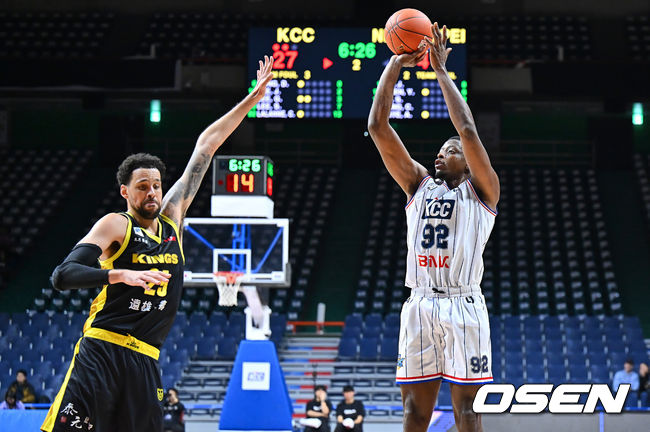 부산 KCC 캐디 라렌이 뉴 타이베이 킹스 Austin Daye의 마크를 피해 3점슛을 시도하고 있다. 2025.01.21 / foto0307@osen.co.kr
