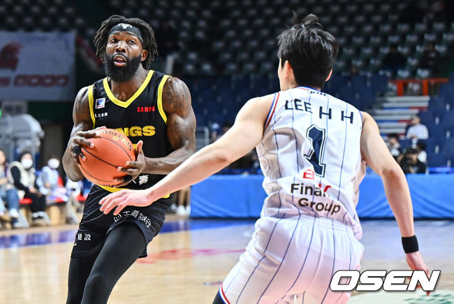 뉴 타이베이 킹스 Kenneh Manigault Jr.가 부산 KCC 이호현의 마크를 피해 골밑슛을 시도하고 있다. 2025.01.21 / foto0307@osen.co.kr