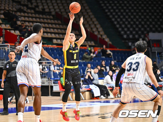 뉴 타이베이 킹스 Lee Kai-Yan이 부산 KCC 캐디 라렌의 마크를 피해 3점슛을 시도하고 있다. 2025.01.21 / foto0307@osen.co.kr