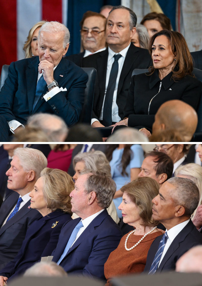 트럼프 취임사 듣는 전직 대통령들 조 바이든 전 미국 대통령(위쪽 사진 앞줄 왼쪽), 카멀라 해리스 전 부통령(위쪽 사진 앞줄 오른쪽)이 20일 워싱턴 의회 로툰다홀에서 열린 도널드 트럼프 대통령의 취임식에서 굳은 표정으로 취임사를 듣고 있다(위쪽 사진). 이날 트럼프 대통령은 취임사에서 바이든 행정부의 주요 정책을 노골적으로 비판했다. 이날 빌 클린턴 전 대통령과 부인 힐러리 전 국무장관, 조지 W 부시 전 대통령과 부인 로라 여사, 버락 오바마 전 대통령(아래쪽 사진 앞줄 왼쪽부터)도 참석했다. 워싱턴=AP 뉴시스 |
