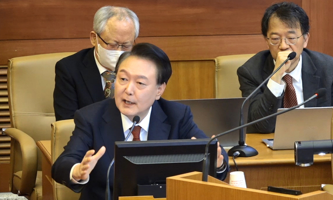 윤석열 대통령이 21일 오후 서울 종로구 헌법재판소에서 열린 탄핵심판 3차 변론에 출석해 피청구인석에서 발언하고 있다. 헌법재판소 제공. |