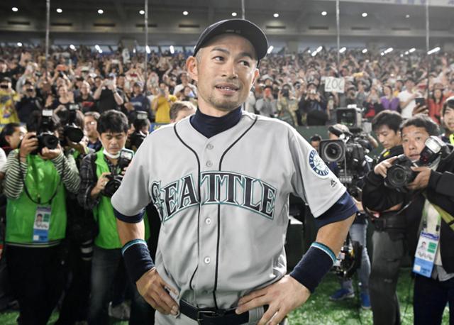 스즈키 이치로가 시애틀 소속이던 2019년 3월 21일 일본 도쿄돔에서 열린 오클랜드와 경기를 마친 뒤 팬들에게 인사하고 있다. 도쿄=로이터 연합뉴스 |